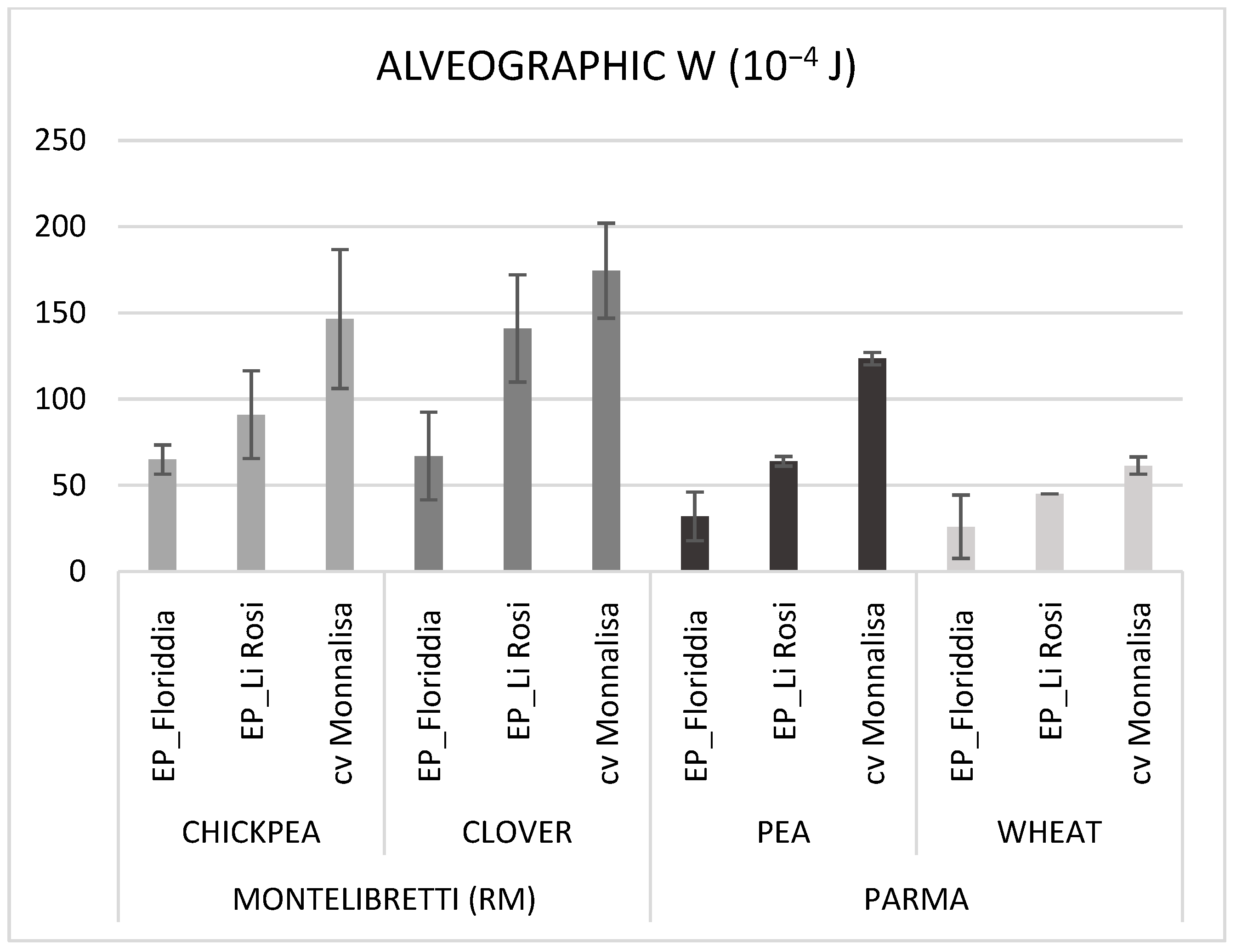 - American Association of Cereal Chemists. Approved Methods of Analysis, Method 54-30.02 Alveograph Method for Soft and Hard Wheat Flour, 11th ed.; AACC International: St. Paul, MN, USA, 2010. [Google Scholar]