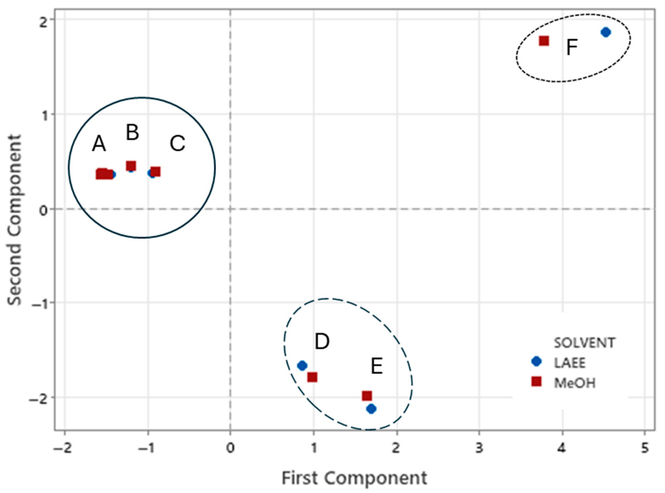 - Guillen, E.; Terrones, H.; de Terrones, T.C.; Simirgiotis, M.J.; Hájek, J.; Cheel, J.; Sepulveda, B.; Areche, C. Microwave-Assisted Extraction of Secondary Metabolites Using Ethyl Lactate Green Solvent from Ambrosia arborescens: LC/ESI-MS/MS and Antioxidant Activity. Plants 2024, 13, 1213. [Google Scholar] [CrossRef] [PubMed]