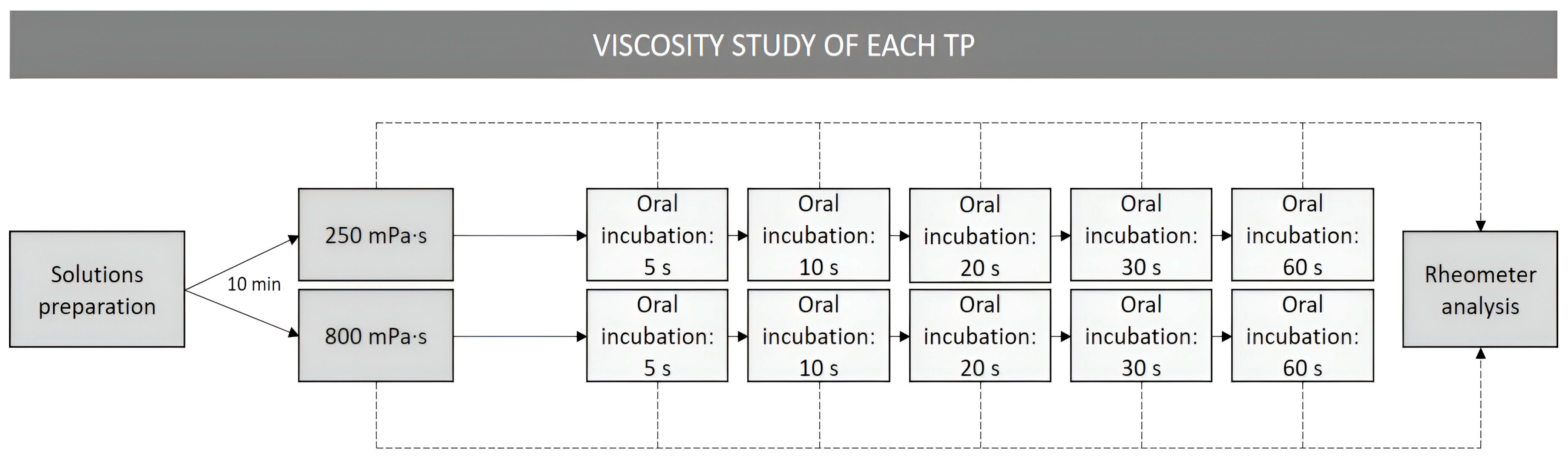 - Hanson, B.; O’leary, M.T.; Smith, C.H. The Effect of Saliva on the Viscosity of Thickened Drinks. Dysphagia 2012, 27, 10–19. [Google Scholar] [CrossRef]