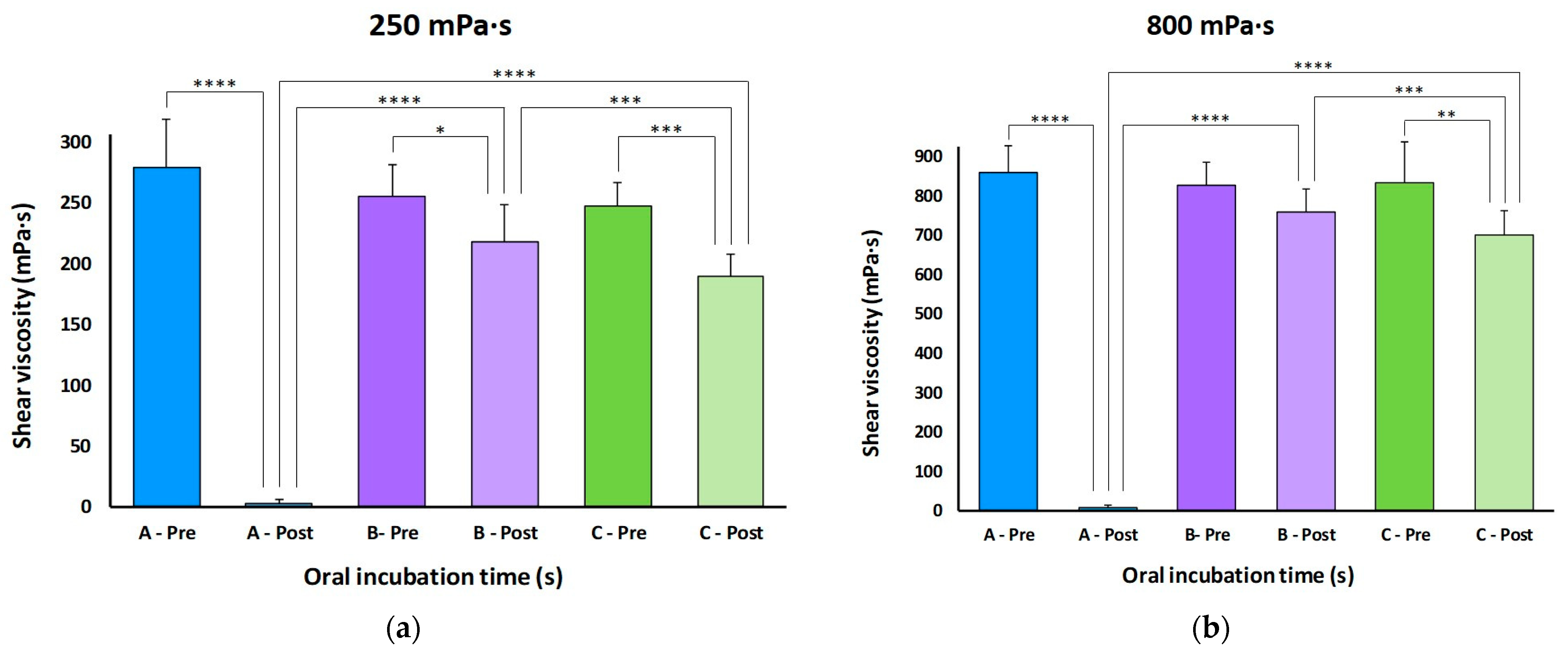 | Thickening Product | Viscosity Level | Shear Viscosity Pre-Oral at 300 s−1 (mPa·s) | Shear Viscosity Post-Oral at 300 s−1 (mPa·s) | Shear Thinning (% Reduction) |