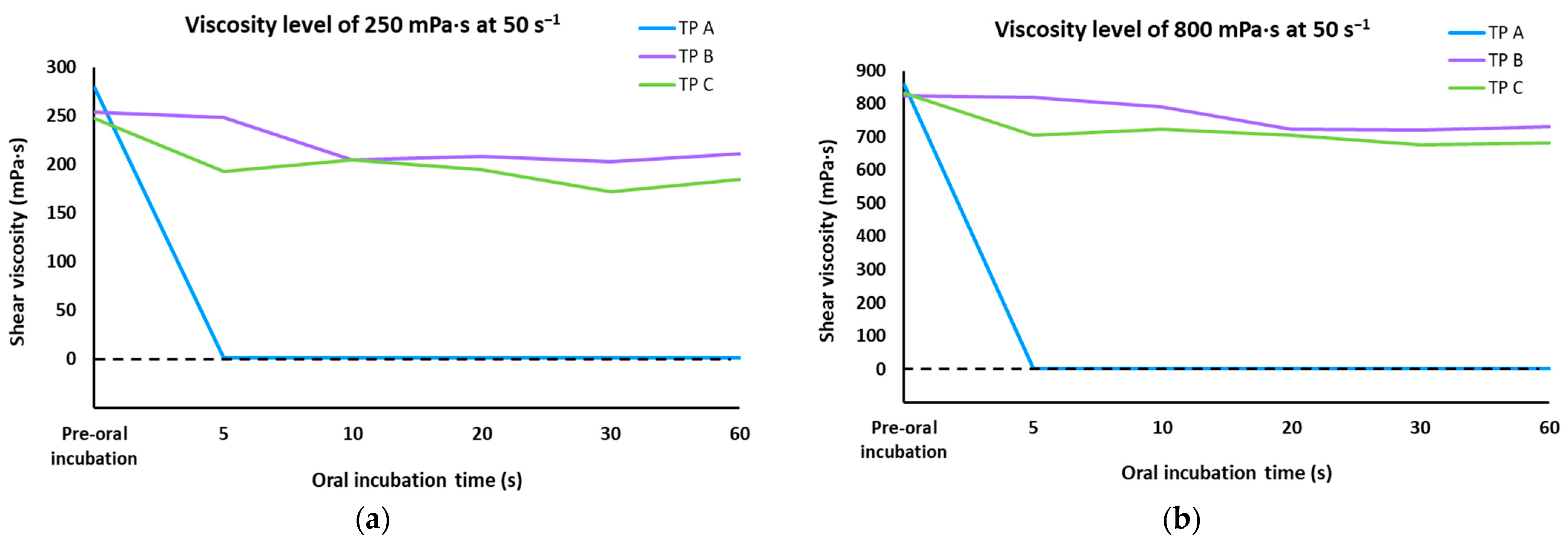 - Tobar-Fredes, R.; McIntosh-García, J.; Montenegro-Saá, A.; Flores-Jara, C.; Correa, O. Impact of Oral Processing on Liquid Food Viscosity: Clinical Implications for Dysphagia Management. Rev. Chil. Nutr. 2025, 52, 235–241. [Google Scholar] [CrossRef]