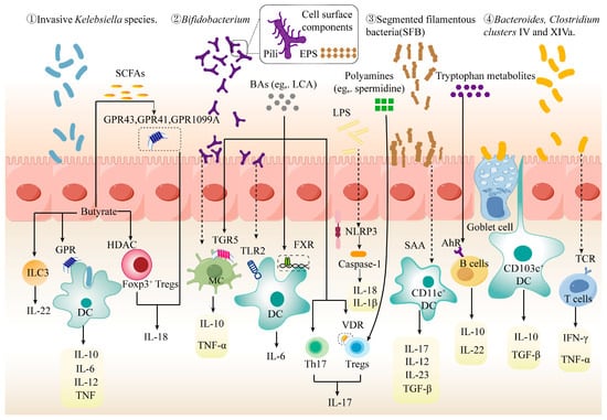Research confirmed that the gut microbiota modulates the release of inflammatory cytokines by either directly colonizing or indirectly adhering to epithelial cells (Figure 1). Firstly, certain gut microorganisms, such as invasive Klebsiella species, can directly colonize intestinal epithelial cells. These organisms are phagocytosed by dendritic cells (DCs), stimulating the release of IL-6, TNF, and IL-12 []. Secondly, the surface components of gut microbes, including extracellular polysaccharides (EPS) and pili, enhance their adhesion to intestinal epithelial cells []. For instance, Bifidobacterium with a thicker EPS layer not only directly regulates the secretion of IL-10 and TNF-α by macrophages but also modulates the secretion of IL-6 by DCs via the Toll-like receptor 2 (TLR2) receptor []. Additionally, Bifidobacterium with pili enhances the adhesion to intestinal epithelial cells and regulates the secretion of TNF-α by macrophages compared to no pili control strains []. Thirdly, segmented filamentous bacteria (SFB) stimulate the secretion of TGF-β, IL-12, IL-23, and IL-17 by CD11c+ DC cells, mediated by the release of serum amyloid A (SAA) from epithelial cells. Fourthly, specific gut microbes, such as Bacteroides species or Clostridium clusters IV and XIVa, can directly regulate CD103+ DC cells through goblet cells, promoting the secretion of TGF-β and IL-10 []. Furthermore, Firmicutes with substrate-binding protein (SBP) and Bacteroidetes with tetratricopeptide repeat lipoprotein (TPRL) can selectively recognize T-cell receptors (TCRs), thereby regulating the secretion of TNF-α and IFN-γ []. In summary, the gut microbiota can directly or indirectly regulate the release of inflammatory cytokines, thereby influencing host immune function.