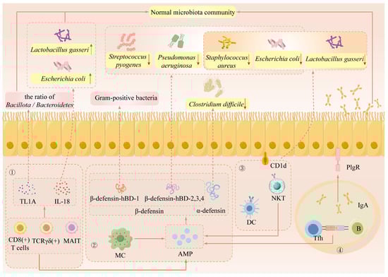 The composition of gut microbiota can be either directly or indirectly regulated by host immune cells, such as macrophages, T cells, and B cells, through the action of inflammatory cytokines (Figure 2). Firstly, the composition of the gut microbiota can be regulated by the secretion of two antimicrobial peptides (AMPs), α-defensin or β-defensin, by macrophages, natural killer T cells (NKT), and B cells []. For instance, α-defensins can regulate the overgrowth of Clostridium difficile []. While β-defensin-hBD-1 is only active against Gram-positive bacteria, β-defensin HBD-2, 3, and 4 exhibit antibacterial action against Escherichia coli (E. coli), Pseudomonas aeruginosa, Staphylococcus aureus, and Streptococcus pyogenes. Secondly, TL1A and IL-18 release can be regulated by TCRγδ(+), CD8(+) T cells, and muco-associated immutable T cells (MAIT), which in turn can alter the ratio of Bacillota/Bacteroidetes, as well as the contents of Lactobacillus and E. coli [,]. Thirdly, NKT can selectively identify lipid antigens presented by CD1d on DC cells and intestinal epithelial cells. Additionally, NKT can control the makeup of symbiotic microbes such as Lactobacillus gasseri, Staphylococcus aureus, and E. coli []. Lastly, polymerized immunoglobulin receptors (pIgR) allow IgA antibodies made by B cells and follicular helper T (Tfh) cells to enter the intestinal lumen and control the composition of the gut microbiota [].