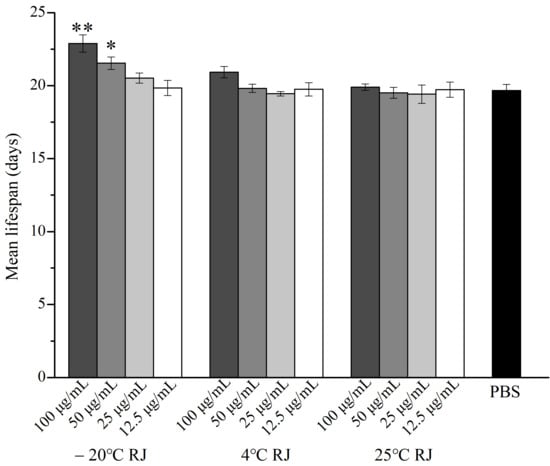 Under the experimental conditions, the effect of different storage temperatures and dilution ratios of RJ on the lifespan of C. elegans are shown in Figure 1 and Table 2. During the experiment, the data of the nematodes that died due to operational errors or accidents were excluded. After administering with 100 μg/mL, 50 μg/mL and 25 μg/mL RJ stored at −20 °C, the mean lifespan of C. elegans increased to 22.89 ± 0.59, 20.68 ± 0.73 and 20.52 ± 0.34 days, respectively, which expanded the lifespan of C. elegans by 16.37%, 9.53% and 4.32%, respectively, compared to the control group. However, RJ stored at 4 °C and 25 °C did not affect the lifespan of C. elegans. These results suggested that only fresh RJ can prolong the lifespan of C. elegans.