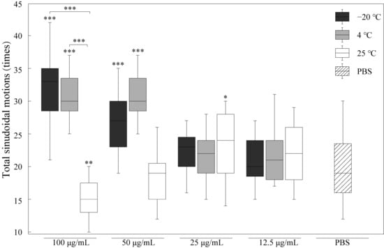 Effects of RJ at different storage temperatures and dilution ratios on motility of C. elegans. Data were expressed as the mean ± SD (n = 3). Bars with different asterisks indicate statistical significance (* p < 0.05, ** p < 0.01 and *** p < 0.001).