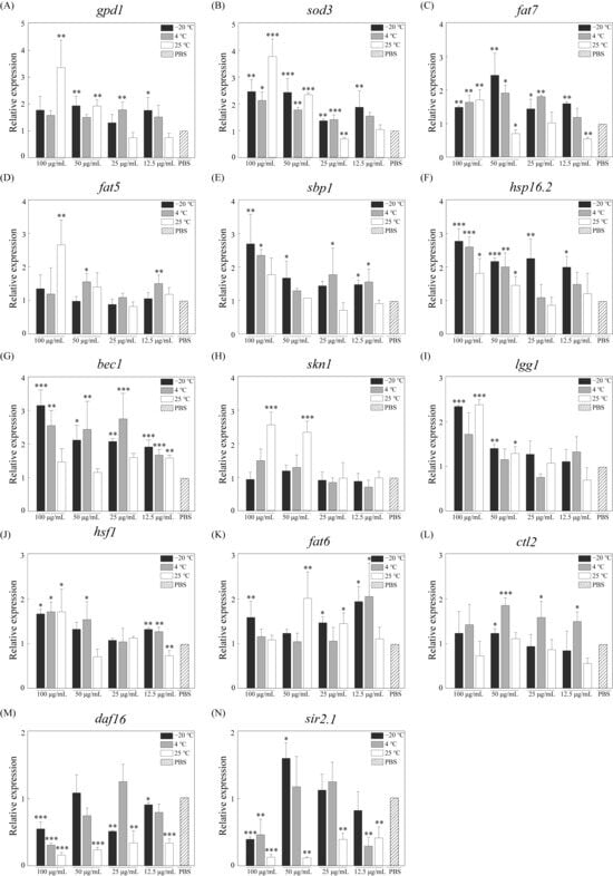Relative expression levels of aging- and vitality-related genes in C. elegans after treatment with RJ at various storage temperatures and dilution ratios. (A) gpd1, (B) sod3, (C) fat7, (D) fat5, (E) sbp1, (F) hsp16.2, (G) bec1, (H) skn1, (I) lgg1, (J) hsf1, (K) fat6, (L) ctl2, (M) daf16, (N) . * p < 0.05, ** p < 0.01 and *** p < 0.001.