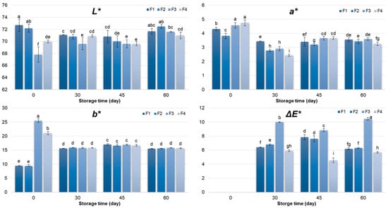 Colour characteristics (L*, a*, b*, ΔE*) of chicken pâté samples during 60 days storage period. L*—lightness; a*—redness; b*—yelowness; ΔE*—total colour difference; F1 (soy protein isolate + sunflower oil); F2 (soy protein isolate + rapeseed oil); F3 (rapeseed protein isolate + sunflower oil); F4 (rapeseed protein isolate + rapeseed oil). Different letters above the bars indicate significant differences (p < 0.05).