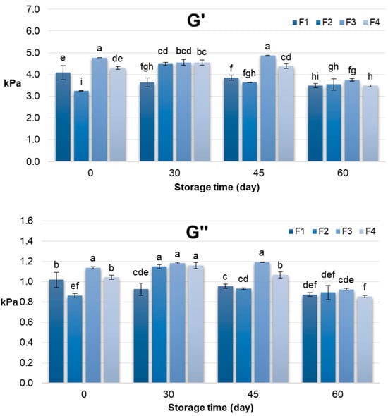 Rheological characteristics (G′ and G″) of chicken pâté samples during 60 days storage period. G′—storage modulus; G″—loss modulus; F1 (soy protein isolate + sunflower oil); F2 (soy protein isolate + rapeseed oil); F3 (rapeseed protein isolate + sunflower oil); F4 (rapeseed protein isolate + rapeseed oil). Different letters above the bars indicate significant differences (p < 0.05).