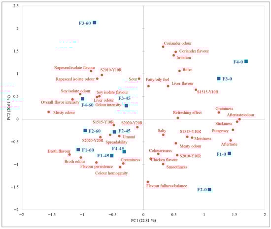 Principal Component Analysis (PCA) biplot of sensory characteristics of chicken pâté samples during 60 days storage period. F1 (soy protein isolate + sunflower oil); F2 (soy protein isolate + rapeseed oil); F3 (rapeseed protein isolate + sunflower oil); F4 (rapeseed protein isolate + rapeseed oil); PC1 and PC2—principal components explaining the variability of sensory attributes.