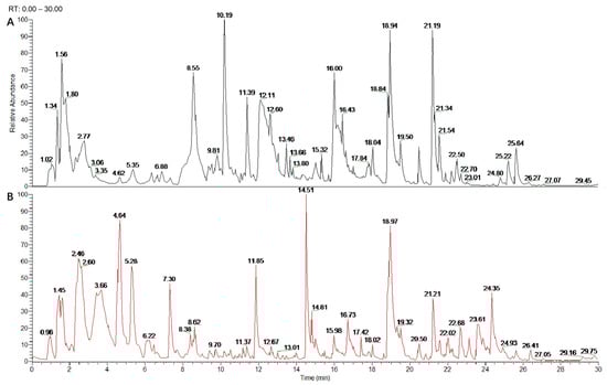 UHPLC Q-Exactive Orbitrap MS analysis of DAE phytochemical composition. Positive ion chromatogram of DAE (A); anion chromatogram of DAE (B).