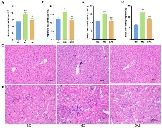 DAE alleviated hepatic and renal damage in mice with HUA: alanine transaminase (A); aspartate transaminase (B); serum creatinine (C); blood urea nitrogen (D); H&E staining of the liver (E); and H&E staining of the kidney (F) (at a magnification of 200×). * p < 0.05 and ** p < 0.01: NC group vs. MC group; # p < 0.05 and ## p < 0.01: MC group vs. DAE group. The arrows show the apparent damage (black arrow: focal necrosis of hepatocytes; red arrow: focal infiltration of inflammatory cells; and blue arrow: inflammatory cell infiltration).