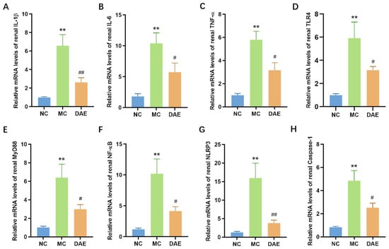 DAE reduced the levels of renal inflammation cytokines in mice with HUA. Relative mRNA expression of IL-1β (A); IL-6 (B); TNF-α (C); TLR4 (D); MyD88 (E); NF-κB (F); NLRP3 (G); and Caspase-1 (H). * p < 0.05 and ** p < 0.01: NC group vs. MC group; # p < 0.05 and ## p < 0.01: MC group vs. DAE group.