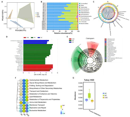DAE modulated gut microbiota disorder in mice with HUA: PCoA diagram (A); gut microbiota composition at the phylum (B) and genus (C) levels; LEfSe (D); Cladogram (E); and Tax4Fun analysis according to the KEGG database at level 2 (F) and level 3 (G).