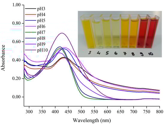 UV—Vis spectra and photographs of curcumin solutions at different pH values (3–10).