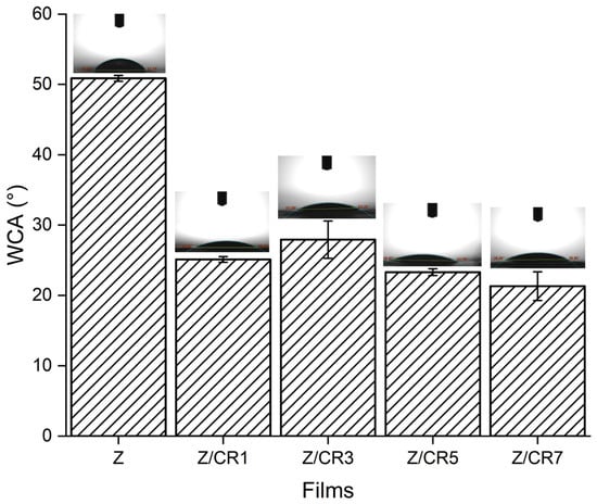 The surface wettability of zein films containing different amounts of curcumin was evaluated by water contact angle (WCA) measurements (Figure 3). Pure zein films (Z) exhibited the highest WCA value (≈52°), indicating their relatively hydrophobic nature. However, the incorporation of curcumin significantly decreased the WCA values (p < 0.05), with Z/CR7 films showing the lowest value (≈21°).