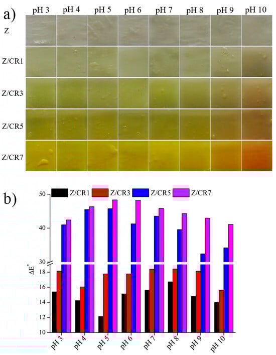 The color response of films to pH variations is also important for their application as freshness indicators. To evaluate this property, films were immersed in buffer solutions ranging from pH 3 to 10. As illustrated in Figure 5a, pure zein films (Z) showed no visible change, whereas curcumin-enriched films exhibited progressive color variations, observable by the naked eye. The calculated ΔE* values confirmed that color differences increased with curcumin concentration and pH level (Figure 5b). The most pronounced color responses were observed in Z/CR5 and Z/CR7 films. This pH sensitivity arises from the structural transformation of curcumin, which exists predominantly in the keto form under acidic and neutral conditions but shifts to the enol form at alkaline pH []. Consequently, curcumin-based films appeared yellow at neutral or acidic pH and turned reddish-brown at alkaline values due to pH-dependent degradation of curcumin [,].