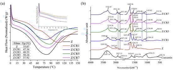 Thermal properties (a) and FTIR spectra (b) of zein films containing curcumin at different concentrations.