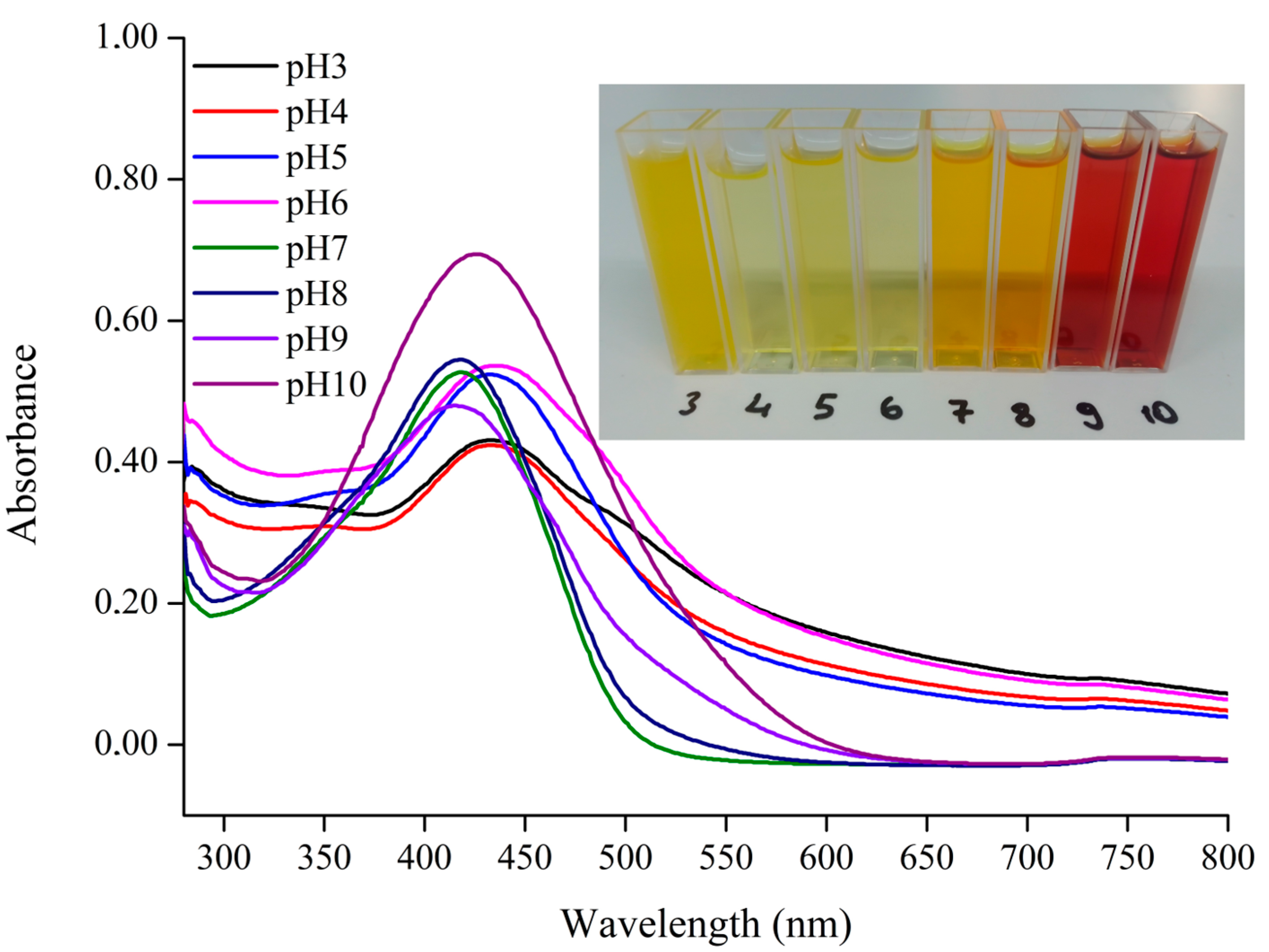 To evaluate the pH-dependent spectral properties, 500 mg of curcumin was dissolved in 10 mL of 70% ethanol. One milliliter of the solution was then mixed with 3 mL of buffer solutions at pH values ranging from 3 to 10. UV—Vis spectra were recorded over the wavelength range of 200–800 nm.