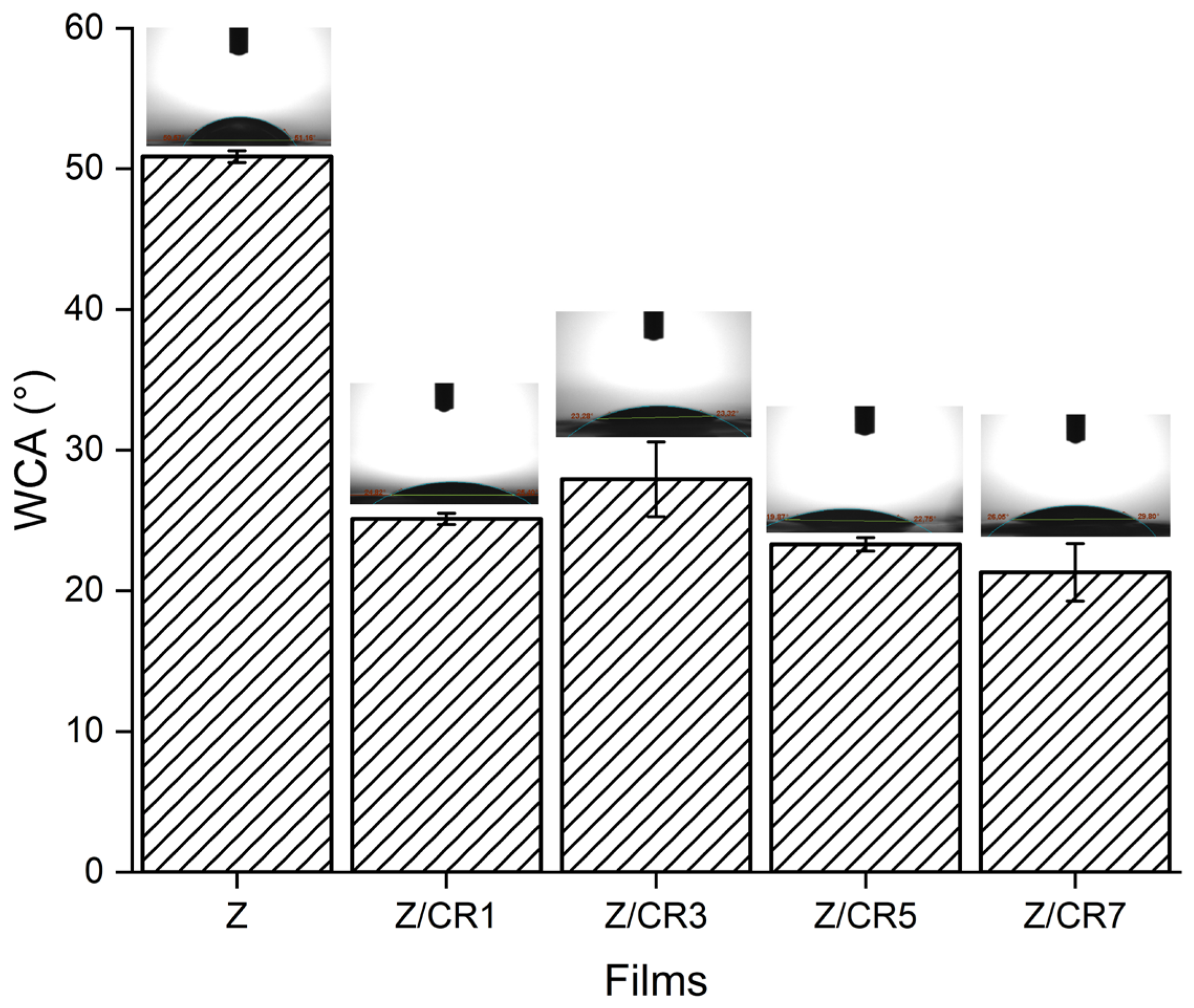 Figure 3. Water contact angle (WCA) of zein films containing different concentrations of curcumin (Z, Z/CR1, Z/CR3, Z/CR5, Z/CR7). Insets show representative droplet images on the film surfaces.