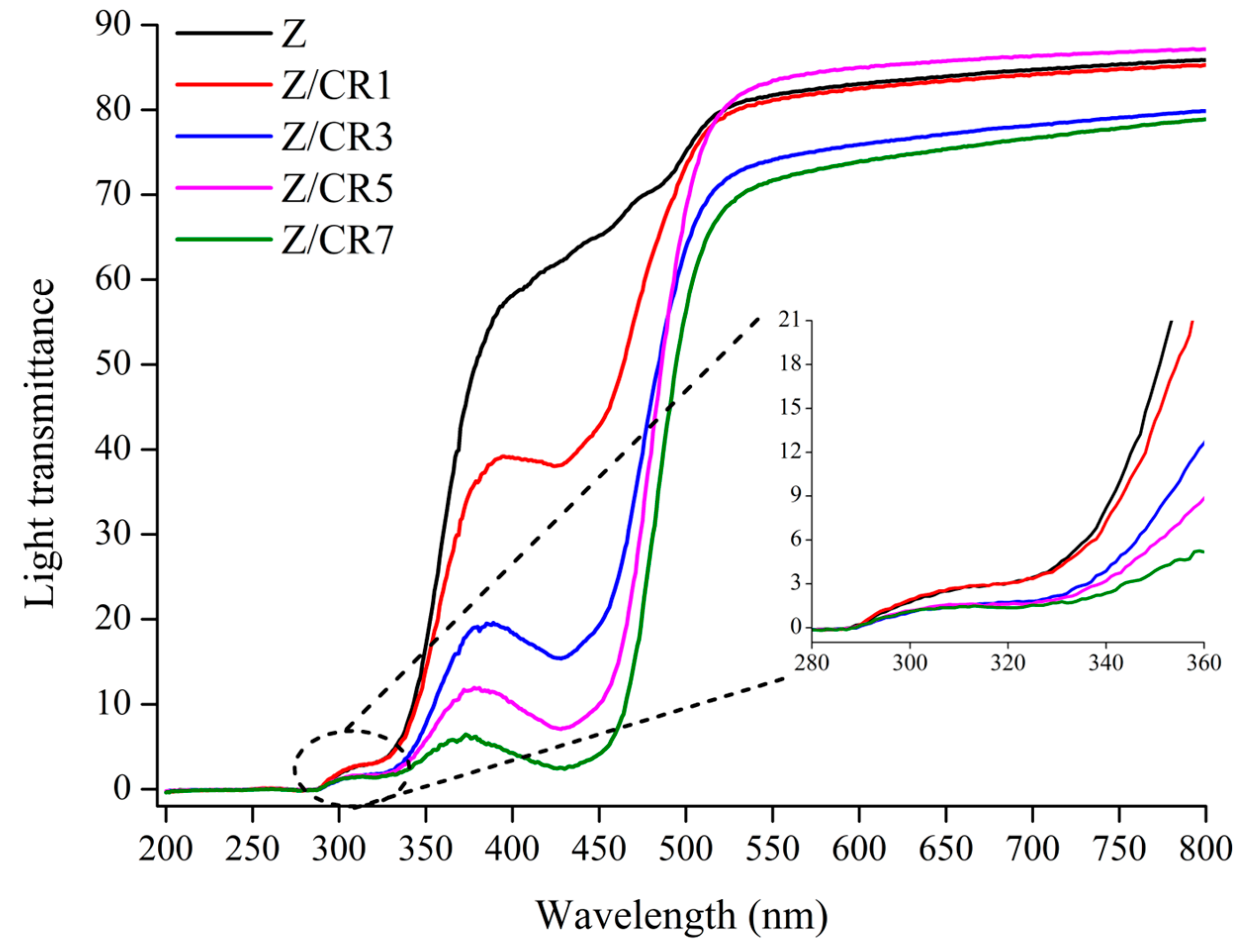 Figure 4. Effect of curcumin incorporation at different concentrations on light transmittance of zein-based films. Z: Neat zein film; Z/CR1: Zein film containing 1% curcumin; Z/CR3: Zein film containing 3% curcumin; Z/CR5: Zein film containing 5% curcumin; Z/CR7: Zein film containing 7% curcumin.