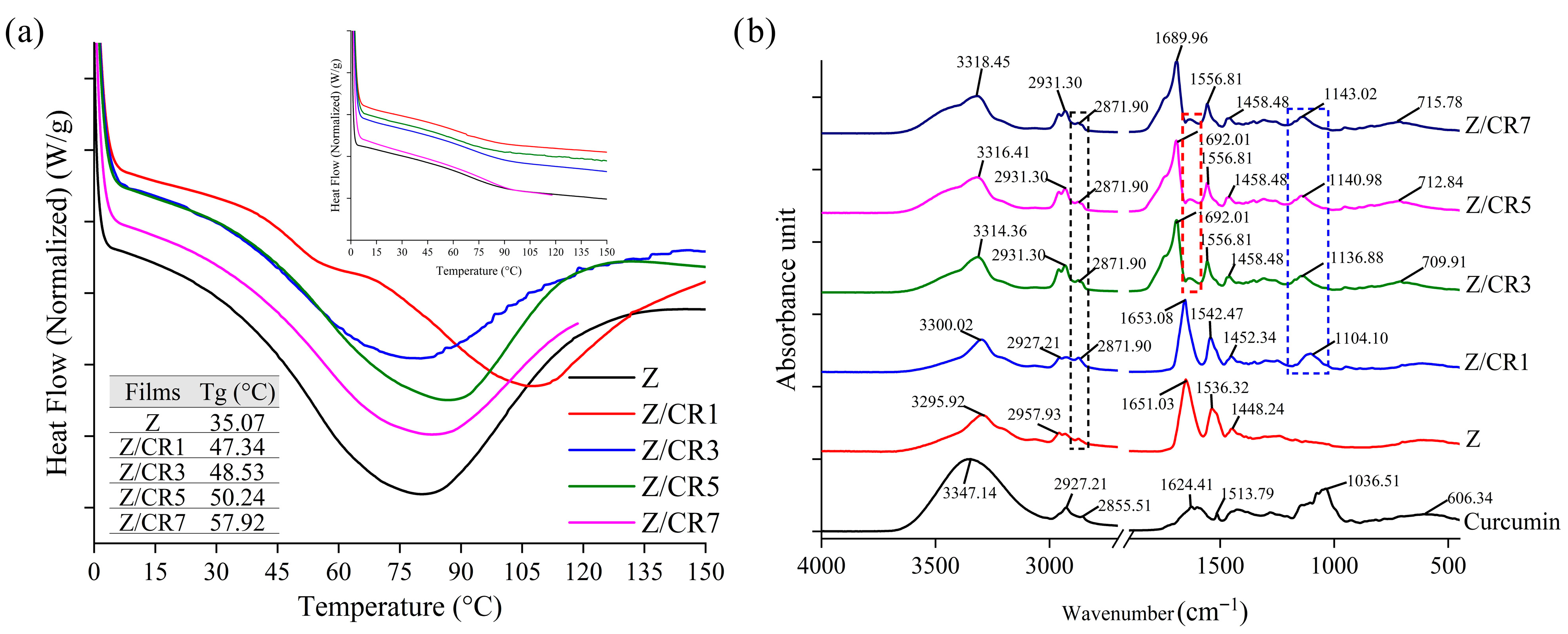 Figure 6. Thermal properties (a) and FTIR spectra (b) of zein films containing curcumin at different concentrations.