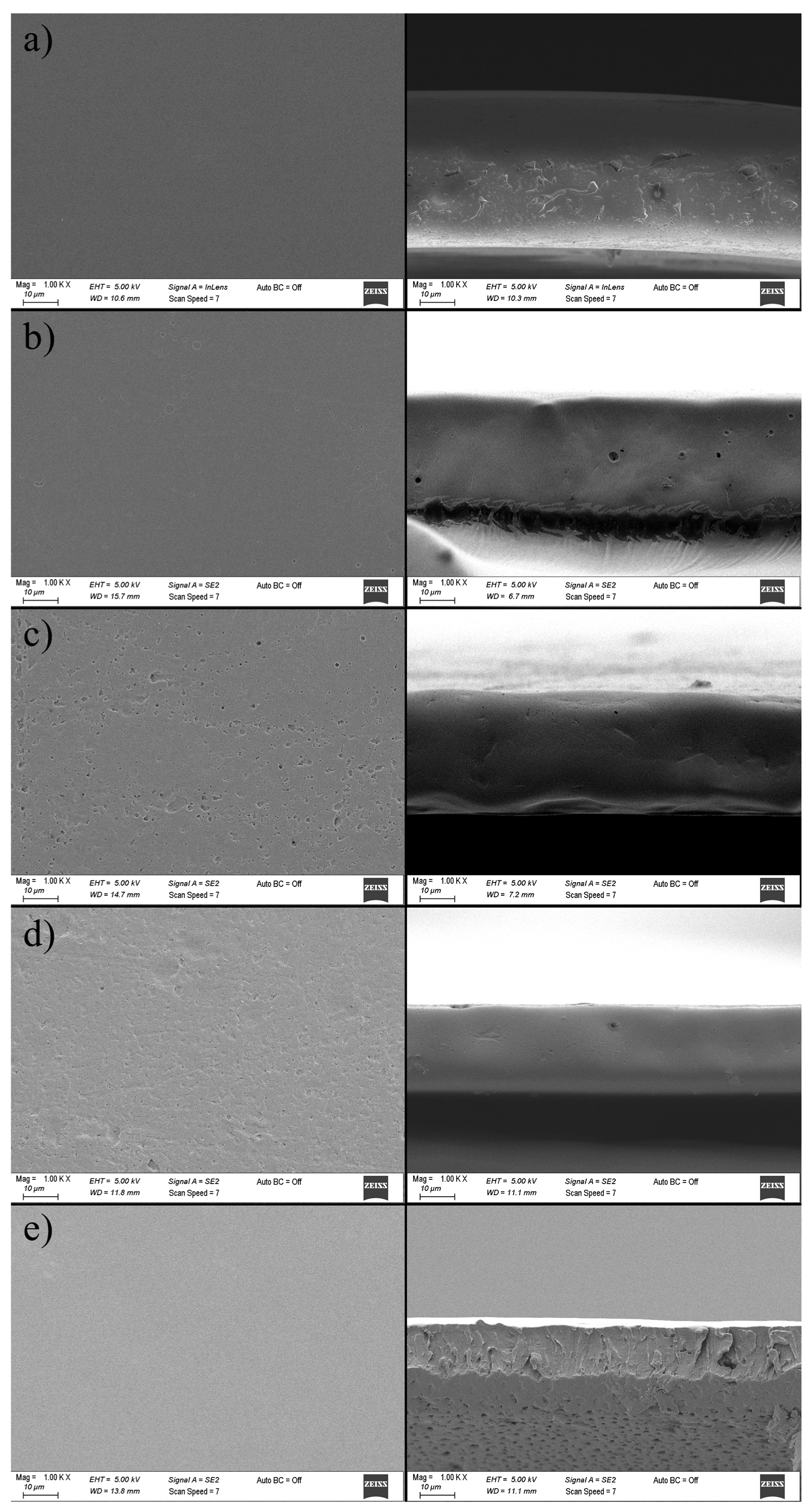 Figure 7. Effect of curcumin incorporation at different concentrations on surface (left) and cross-sectional (right) microstructure of zein-based films. (a) Z; (b) Z/CR1; (c) Z/CR3; (d) Z/CR5; (e) Z/CR7.