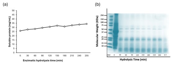 The enzymatic hydrolysis process showed an increase in soluble protein, starting from an initial concentration of 25.9 mg SP/mL. At 30 min post-hydrolysis initiation, the soluble protein content was quantified at 27.52 mg PS/mL, showing a consistent increase of approximately 1 mg SP/mL per 30-minute interval until reaching 32.07 mg SP/mL at 150 min (Figure 3a). Beyond this point, the soluble protein concentration remained stable, with only a minor increase to 34.17 mg SP/mL by the end of the hydrolysis process. The recovery percentage ranged between 59.7% and 73.9% of dry protein, while dialysis resulted in a dry protein content of 80.9% to 84.4% in the extract.