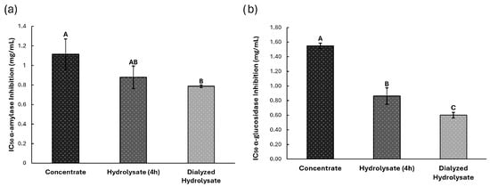 Antidiabetic potential, (a) Inhibition of α-amylase enzyme and (b) Inhibition of α-glucosidase enzyme, for Concentrate, Hydrolyzed and Dialyzed Hydrolysate extracts. Different letters indicate significant differences (p < 0.05).