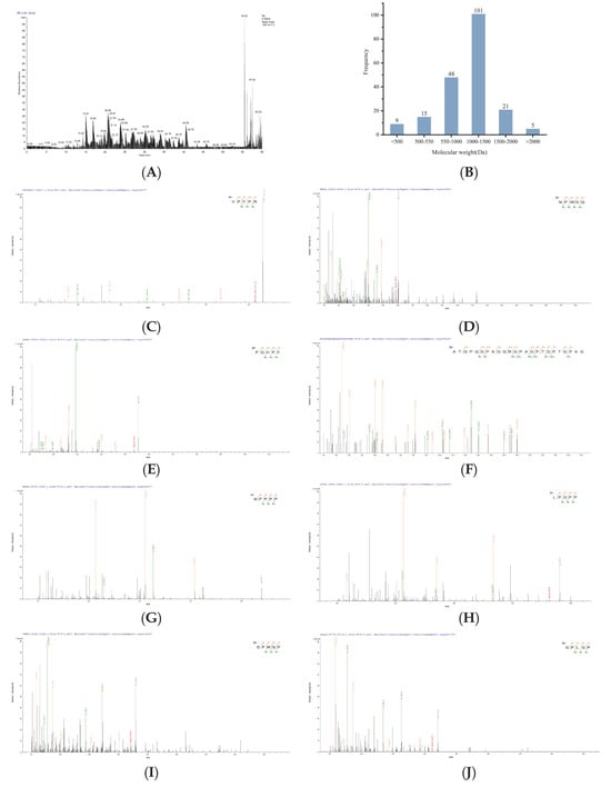 Peptide component U1 was selected for peptide sequencing, leading to the identification of 199 peptide sequences (Table S1). The mass spectrometry profiles are displayed in Figure 2A, and the molecular weights of the peptide fragments are shown in Figure 2B. Bioinformatics approaches can facilitate the discovery of novel bioactive peptides from protein hydrolysates []. Thus, in silico tools were employed to predict and rank the potential bioactivity of these peptides. PeptideRanker results revealed that 46 peptide sequences exhibited scores exceeding 0.5, with higher scores indicating stronger bioactivity and reliability []. Further predictive analysis of toxicity, physicochemical properties, and antioxidant activity (Table 3) demonstrated that 8 peptide sequences reaching the threshold of both PeptideRanker score and radical scavenging capacity score above 0.5 [] were predicted to be non-toxic. Their molecular weights ranged from 439.51 to 2057.18 Da. Studies indicated that most antioxidant peptides derived from food proteins exhibit molecular weights ranging from 500 to 1800 Da [] and typically comprise 2 to 20 amino acid residues [], which aligns with the present findings. The MS/MS spectra of the selected 8 peptides are presented in Figure 2C–J.