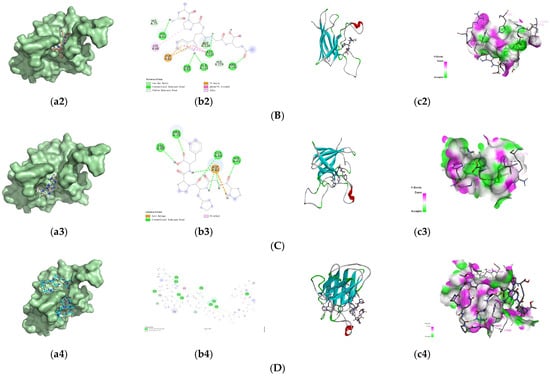 Predicted binding modes of the identified peptides to SOD. (A) VPYPR; (B) NPWGQ; (C) PGHPF; (D) ATGPQGPAGQRGPAGPTGPTGPAG. Each peptide binding to SOD was presented as (a1–a4) surface diagram, (b1–b4) 2D diagram binding residues, and (c1–c4) overall structure and local binding pocket diagram.