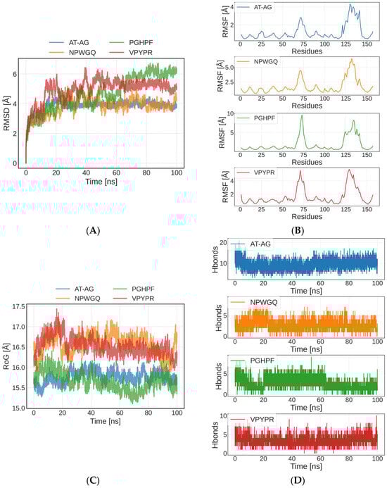Molecular dynamics simulation, a computer simulation method based on classical physics, has been widely adopted to investigate molecular interactions and structural dynamics at the atomic scale []. Using the initial conformation of a complex formed by four peptides with SOD, a molecular dynamics simulation in 100 ns was performed (Figure 4). The stability and flexibility of the receptor–ligand complexes were evaluated by analyzing the root-mean-square deviation (RMSD) and root-mean-square fluctuation (RMSF) of atomic coordinates, where increased deviations and fluctuations may indicate reduced stability []. RMSD measures the displacement of atoms relative to their initial conformation, and monitoring its changes helps reveal structural variations in protein complexes during simulations, thereby assessing their stability and dynamics []. As shown in Figure 4A, the AT-AG-SOD and NPWGQ-SOD complexes exhibited relatively stable overall fluctuations, with the AT-AG-SOD complex demonstrating particularly high stability. The low RMSD values (<10 Å) suggest minimal structural fluctuations during the simulation, strongly indicating that these two peptides maintained stable binding conformations within the SOD binding pocket []. Although the PGHPF-SOD and VPYPR-SOD complexes showed slightly higher RMSD values, they remained below 10 Å, confirming their high stability within the SOD binding site.