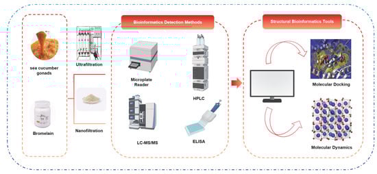 - Feng, J.; Wang, H.; Luo, X.; Zhang, L.; Zhou, P. Identification and Molecular Mechanism of the Anti-Inflammatory Effect of Sea Cucumber Peptides: Network Pharmacology, Molecular Docking and Animal Experiments. Int. J. Biol. Macromol. 2024, 279, 134958. [Google Scholar] [CrossRef]