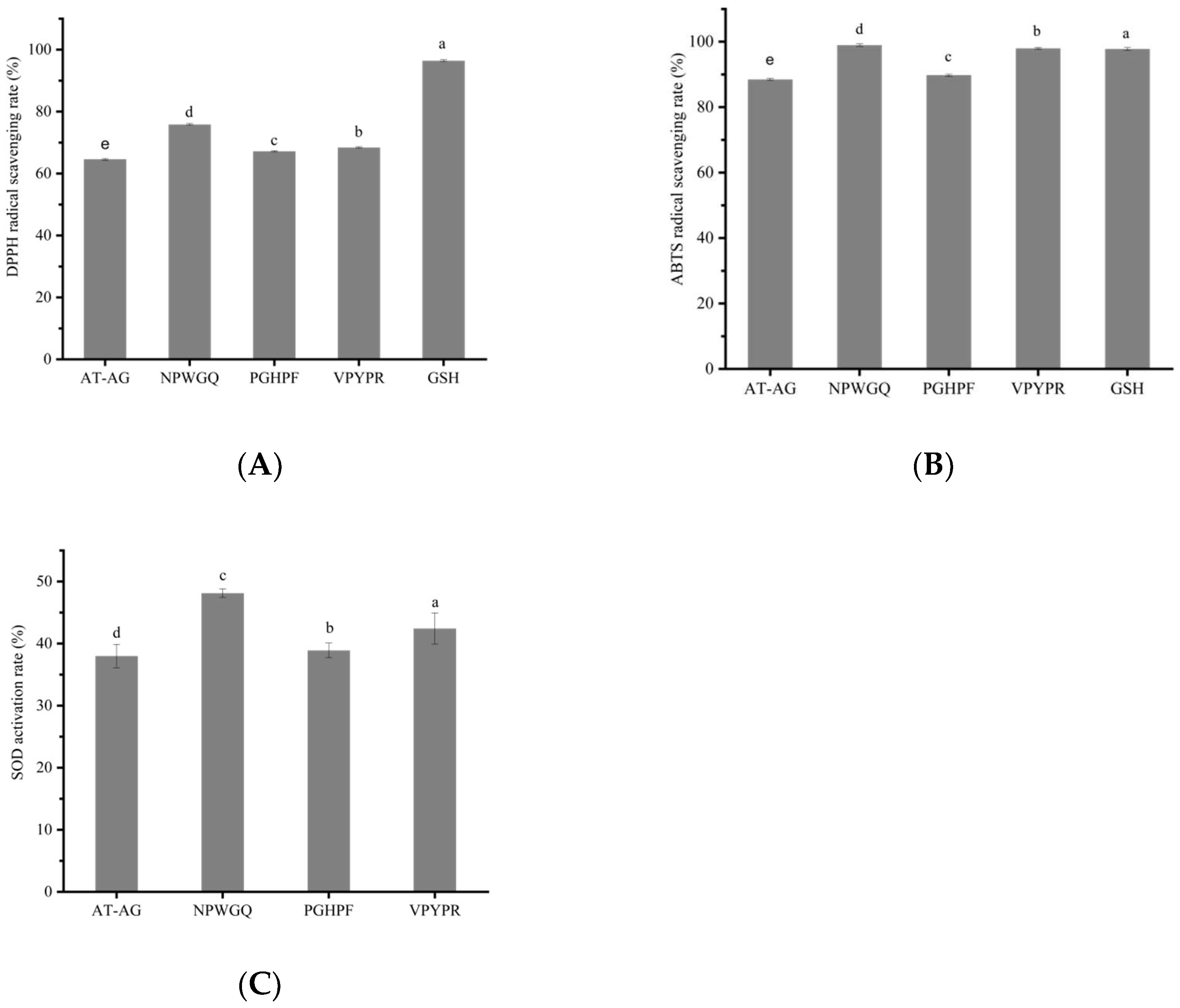 3.6. In Vitro Antioxidant Activity of the Screened Peptides