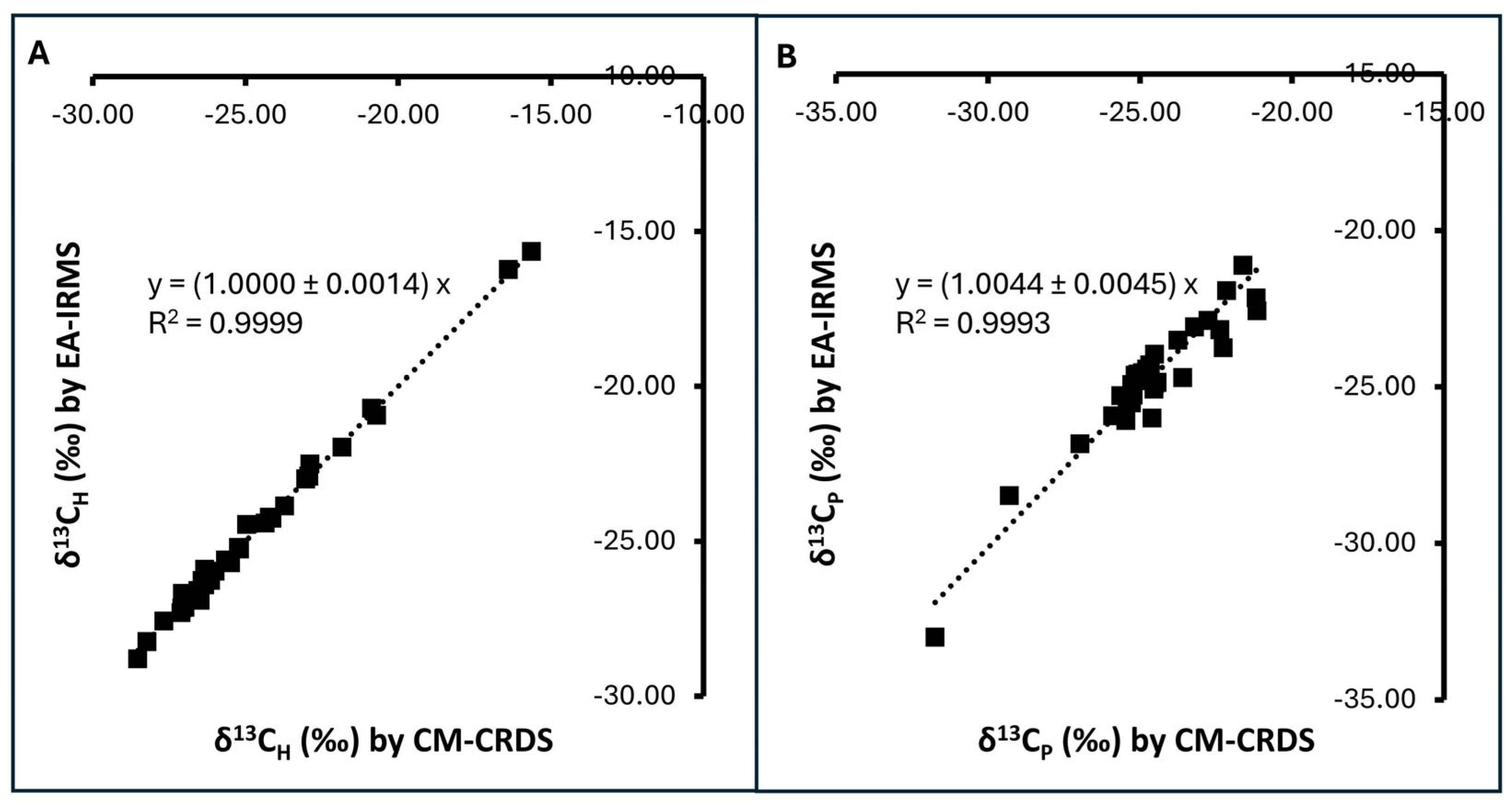 3.2. Comparison Between CM-CRDS and EA-IRMS for δ13C Measurements