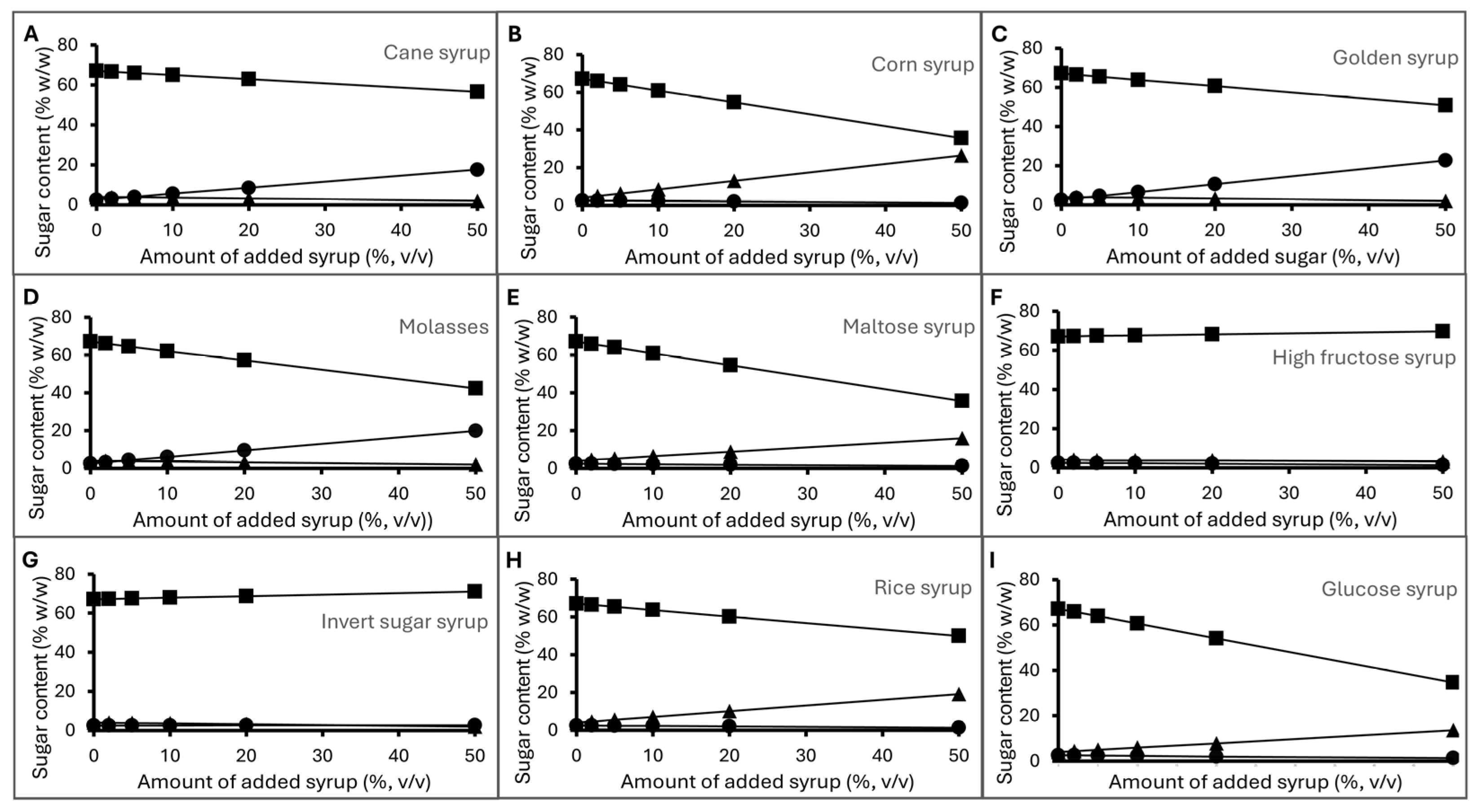 Adulterants used in this study came from commercial supplies. They included maltose syrup, brown rice syrup, molasses, golden syrup, invert sugar, high-fructose syrup 55%, cane syrup, corn syrup, and glucose syrup. For the deliberate adulteration experiment, syrups were added to the authentic honey samples at 2%, 5%, 10%, 20%, and 50% (w/w).