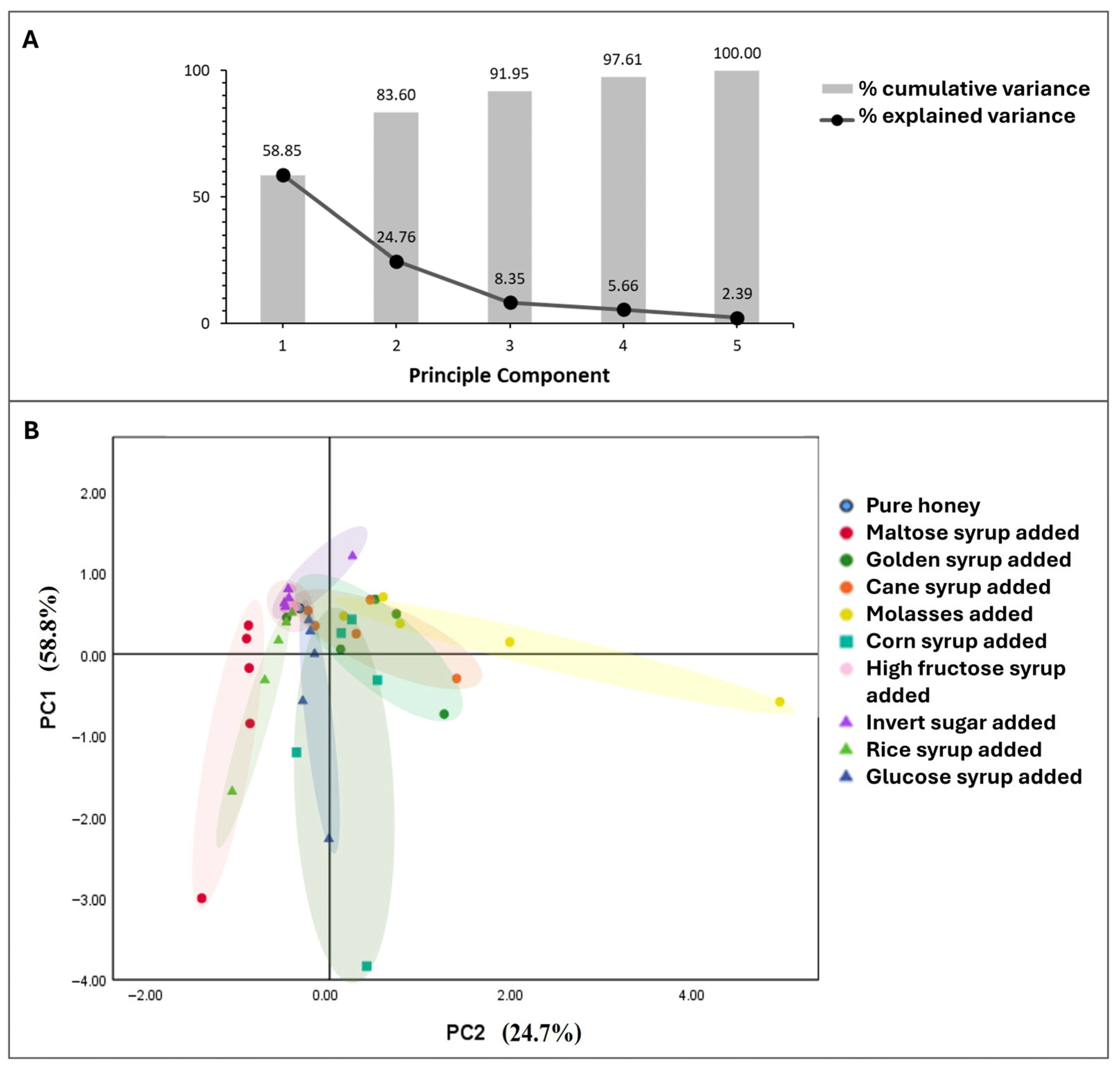 One-way ANOVA was performed to compare the means among groups of samples. Differences were considered statistically significant if p < 0.05. Homogeneity of variances was tested to satisfy ANOVA assumptions. When ANOVA indicated significant differences, Tukey’s Honestly Significant Difference (HSD) post hoc test was conducted to compare all pairs of group means while controlling the Type I error rate. Principal component analysis (PCA) was performed to classify adulterated honey. IBM SPSS (Chicago, IL, USA) Version 19.0.0 was used for both analyses.