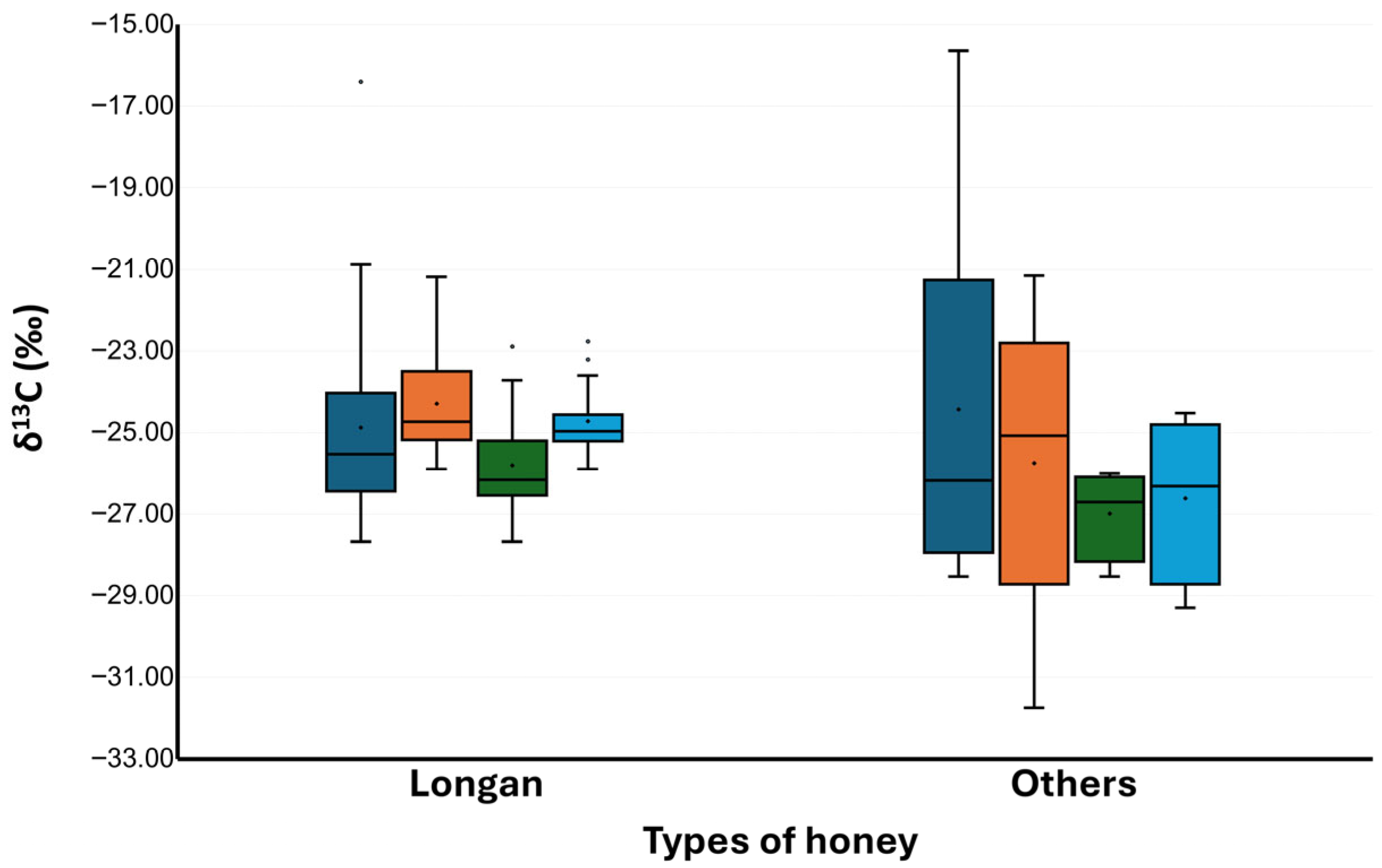 This study investigated the efficacy of combining stable carbon isotope ratio analysis and melissopalynology to authenticate honey purity from undeclared carbon sources and to verify the botanical origin of honey. It covered a range of honey types with an emphasis on longan honey from northern provinces of Thailand and including a few honey samples of other botanical origins from other parts of the country. Combustible-module cavity ringdown spectroscopy (CM-CRDS) was used to establish the method to detect C4 contamination. CM-CRDS requires a lower cost of analysis, is simpler to operate, and has been proven in various studies to have a comparable precision and stability to the standard method, elemental analyzer–isotope ratio mass spectrometry (EA-IRMS) [25,26], making it practical for routine honey testing, especially in smaller laboratories or for on-site testing. In addition, pollen identification and counting were used to verify the nectar sources. We proposed that the two methods can be combined to detect fraudulent honey samples and can potentially be used in the screening of suppliers for the local honey industry in Thailand.