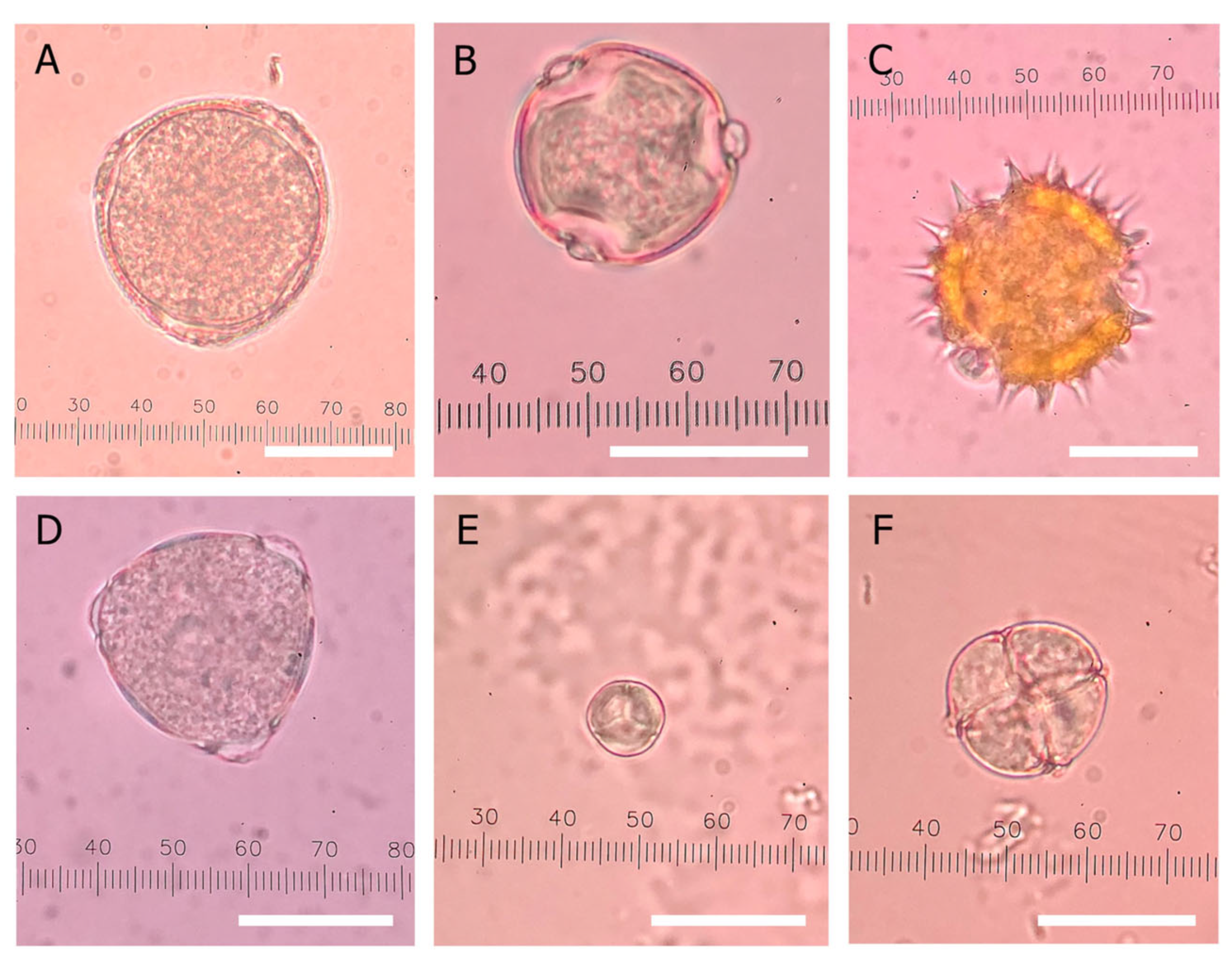 Pollen preparation and analysis were performed according to Louveaux et al., 1978 [24]. A total of 5 g of honey was mixed with 5 mL of sterilized distilled water and centrifuged at 6000 rpm for 30 min. The precipitate was diluted with 100 µL of distilled water and counted using hemocytometers under a microscope with 400× magnification. For each honey sample, quantitative pollen analysis was performed using three independent replicate slides. A minimum of 500 pollen grains was counted per slide, or the entire area scanned if fewer grains were present [24]. Pollens were identified based on comparison with reference slides made from identified plants. Their prevalence was classified according to Louveaux et al., 1978 [24].