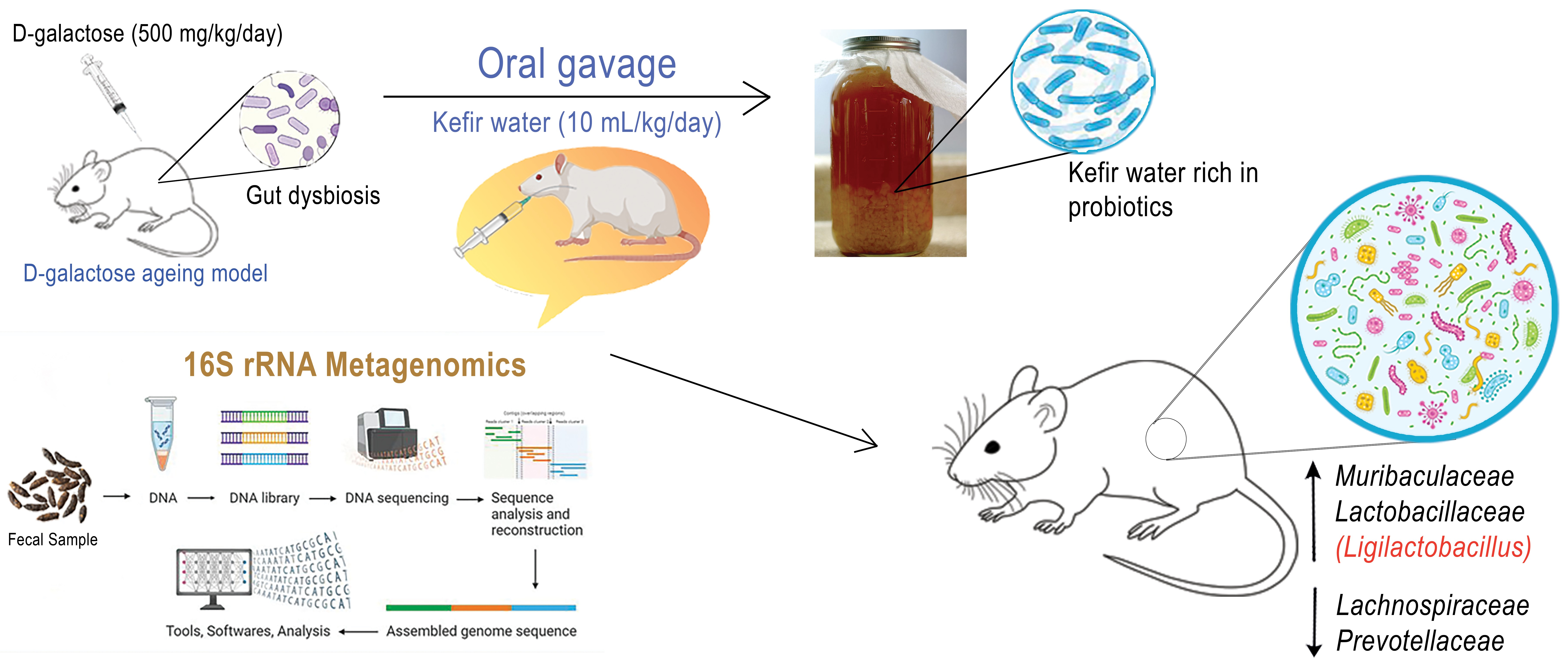 Bifidobacterium species) on gut microbiota composition in D-galactose-induced ageing BALB/c mice. The D-galactose (D-gal)-induced ageing model was used as it closely mimics natural ageing processes through chronic oxidative stress and the accumulation of advanced glycation end products, leading to inflammation and neurodegeneration, making it a well-established system for studying age-related physiological and microbial changes, including gut dysbiosis [