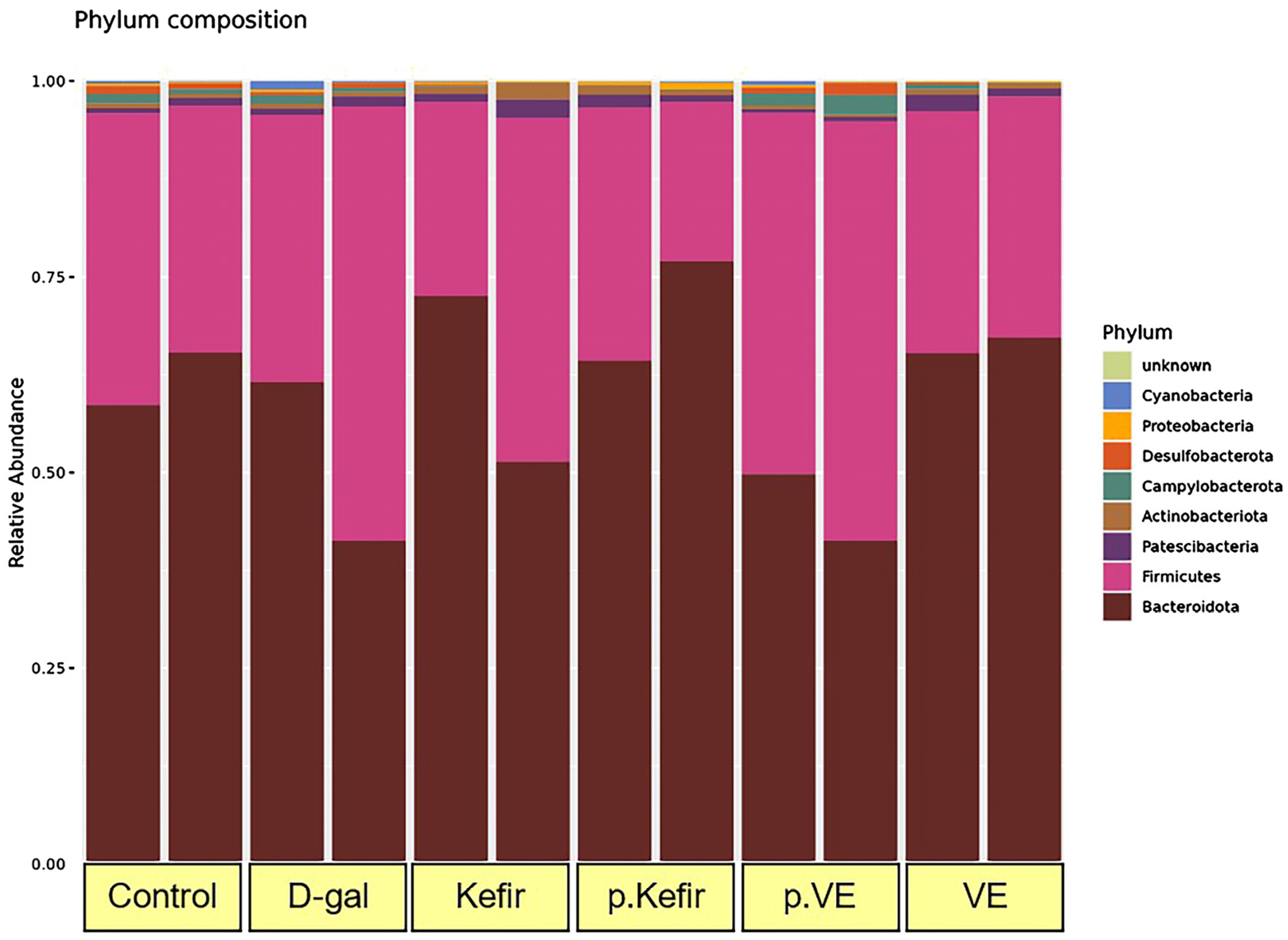 Bacteroidota ratio observed in the D-gal group. These findings represent preliminary observations and warrant further validation with larger sample sizes and functional analyses to confirm the modulatory effects of kefir water on gut microbiota during ageing.