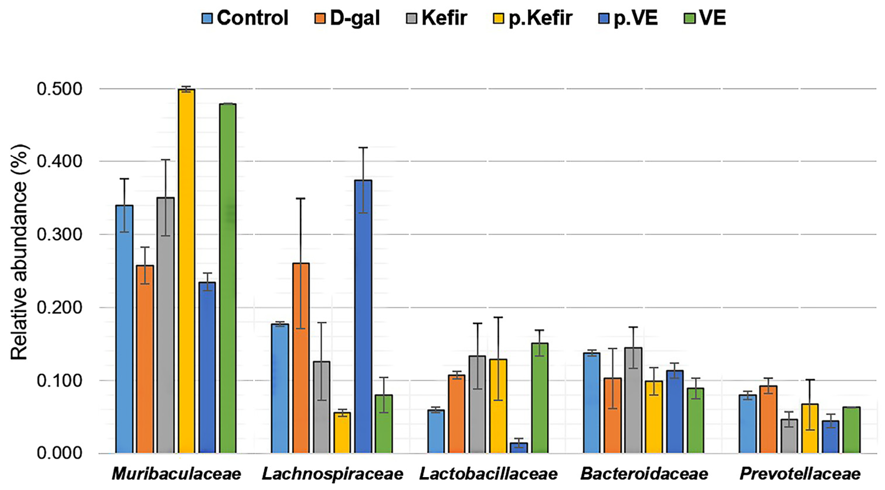 Prevotellaceae observed in both kefir-treated groups compared to the D-gal-treated group was not statistically significant but may indicate a potential trend towards reduced abundance. Nevertheless, this preliminary observation is in line with the findings of Van et al. [