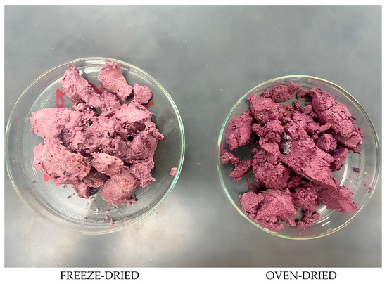 It can be seen in Table 6 that the color parameter L*, which corresponds to luminosity, has a lower value for wine lees dried in an oven at 40 °C. This is because the sample remains in contact with ambient air during drying, making it susceptible to oxidation [63,64]. This decrease in brightness is also associated with darkening from non-enzymatic reactions of the sample when exposed to high temperatures [63].