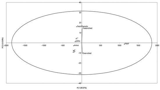 Moisture corresponds to the water content of the food and directly influences its stability. A lower moisture content helps the preservation of the food’s antioxidant activity by reducing microbial growth, oxidation, and hydrolysis of antioxidant compounds, as well as decreasing the water activity in the sample, since there will be fewer water molecules available for chemical reactions in the system, allowing for long periods of storage [25].
