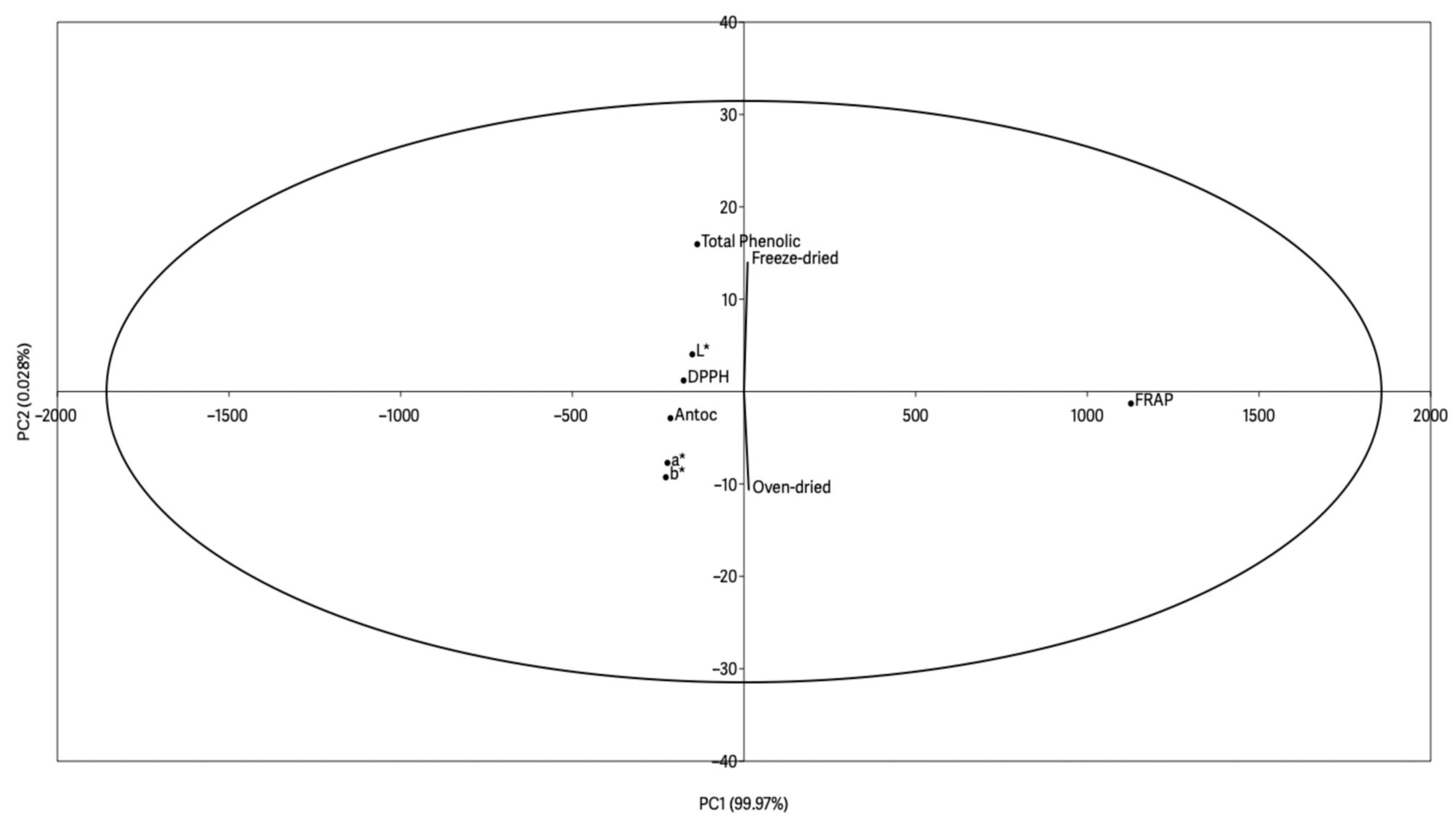 | Freeze-dried with light | 77.92 A* ± 0.08 | 72.20 bA* ± 0.01 | 59.90 bB* ± 0.05 | 0.9574 |