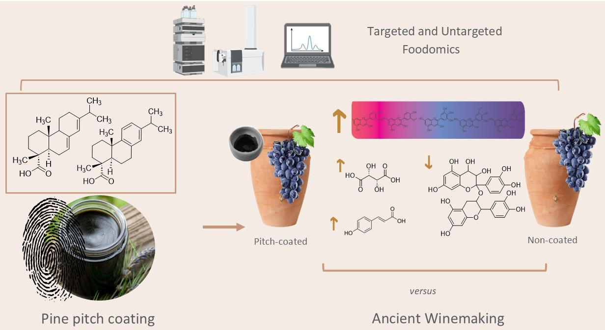 Abarca-Rivas, C.; Lozano-Castellón, J.; Pérez, M.; Corrado, M.; Vallverdú-Queralt, A.; Zifferero, A.; Chessa, R.; Reynolds, P.; Pecci, A.; Lamuela-Raventós, R.M. Exploring the Impact of Pitch-Coated Pottery on Wine Composition: Metabolomics Characterization of an Ancient Technique. Foods 2025, 14, 3857. https://doi.org/10.3390/foods14223857