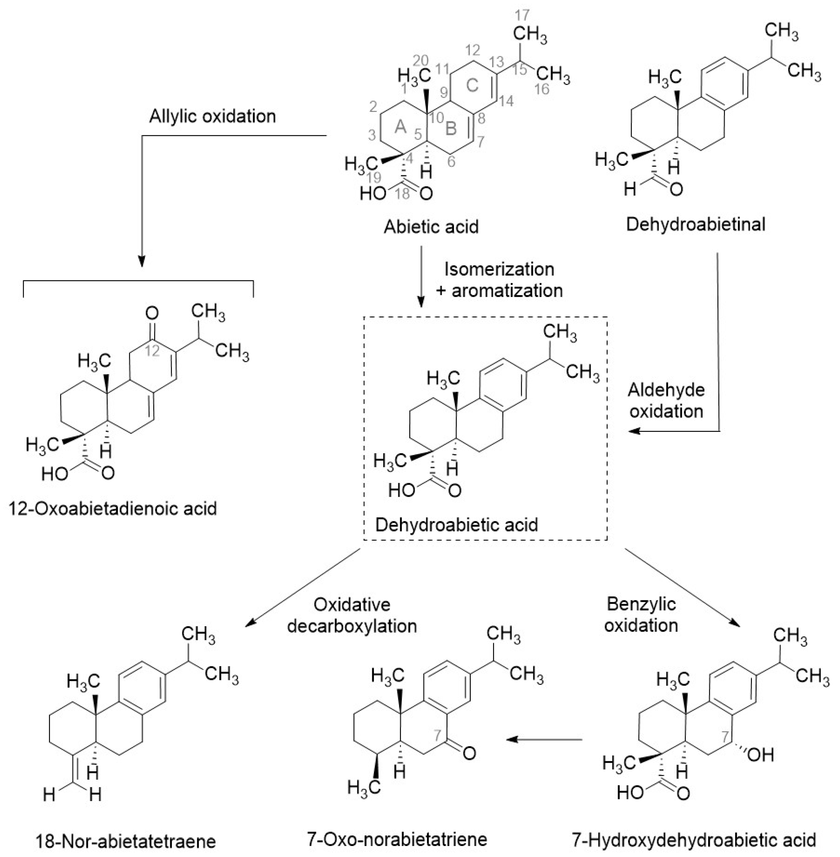 - Prinz, S.; Müllner, U.; Heilmann, J.; Winkelmann, K.; Sticher, O.; Haslinger, E.; Hüfner, A. Oxidation Products of Abietic Acid and Its Methyl Ester. J. Nat. Prod. 2002, 65, 1530–1534. [Google Scholar] [CrossRef] [PubMed]