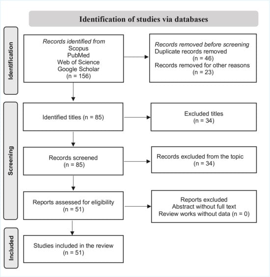 Following the Preferred Reporting Items for Systematic Reviews and Meta-Analyses (PRISMA) guidelines, a systematic literature review was conducted to identify relevant studies on Vaccinium meridionale published between January 2000 and January 2025. The search was conducted in the Scopus, PubMed, Web of Science, and Google Scholar databases using combinations of the Medical Subject Headings (MeSH) terms and keywords such as “Vaccinium meridionale,” “Vaccinium meridionale Swartz,” “bioactive compounds,” “phenolic compounds,” and “anthocyanins.” To improve the accuracy of the results, Boolean operators (AND/OR) were used during the search (Figure 2).
