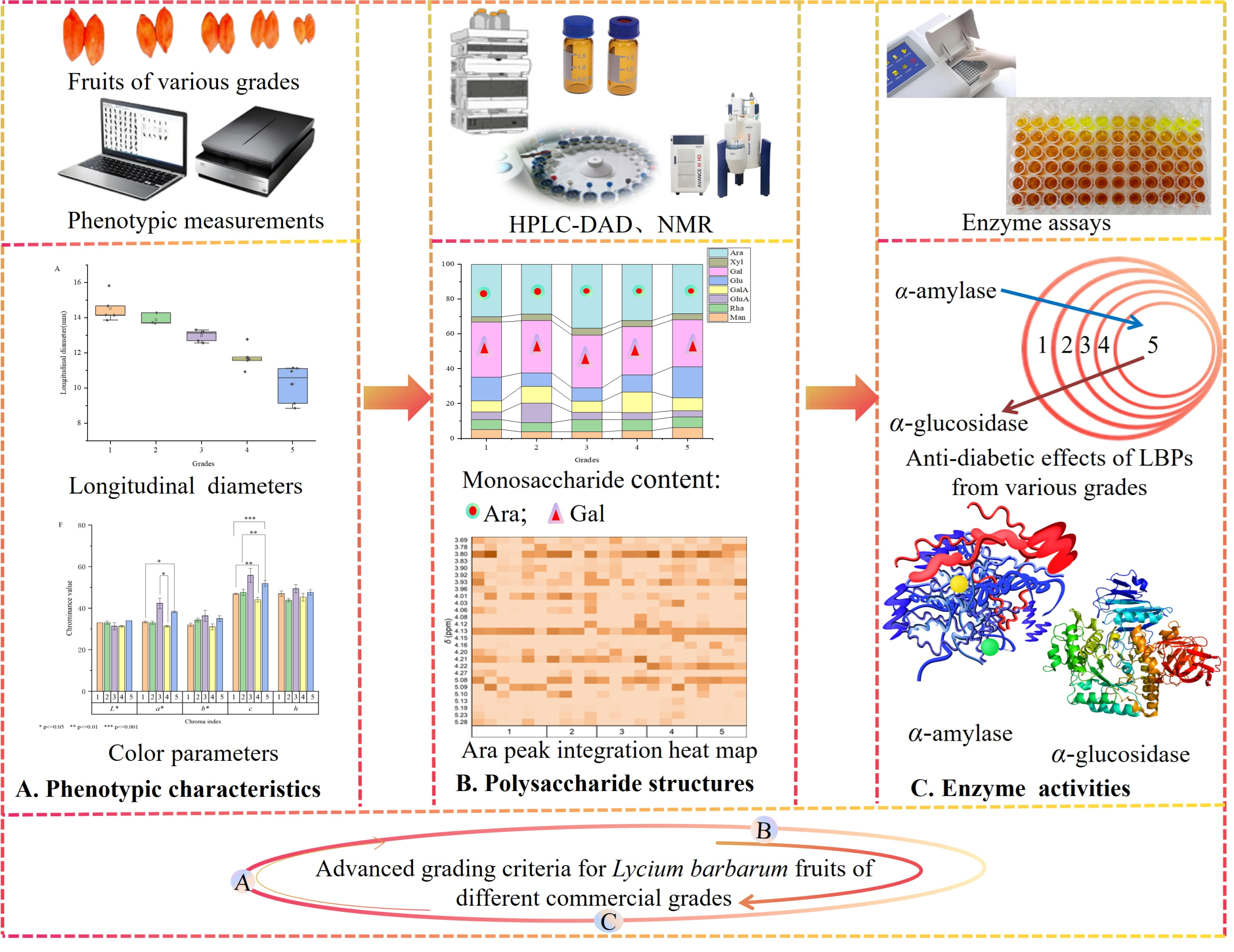 Ma, C.; Liu, F.; Ran, L.; Mi, J.; Lu, L.; Wang, S.; Ge, X.; Jin, B.; Zhang, L.; Yan, Y. Assessment of Phenotypic Characteristics, Polysaccharide Composition, and Hypoglycemic Potential in Different Commercial Grades of Lycium barbarum: A Comprehensive Study Using HPLC and NMR. Foods 2025, 14, 3862. https://doi.org/10.3390/foods14223862