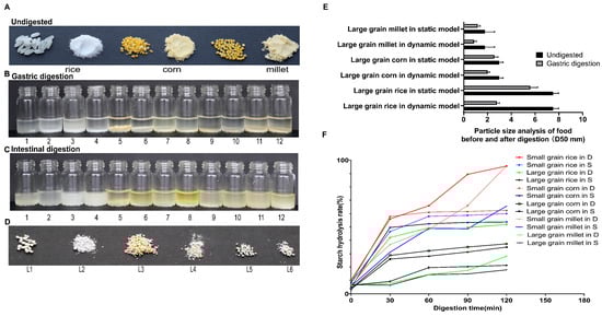 Comparison of digestion outcomes for rice, corn, and millet in static and dynamic models. (A) Representative images of undigested large-grained and small-grained cereals. (B,C) Apparent images after 2 h gastric and intestinal digestion. (D,E) Particle size of large-grained cereals, L1 represents the large-grained rice in a static model, L2 represents the large-grained rice in a dynamic model, L3 represents the large-grained corn in a static model, L4 represents the large-grained corn in a dynamic model, L5 represents the large-grained millet in a static model; L6 represents the large-grained millet in a dynamic model. (F) Starch hydrolysis rates at different time points during intestinal digestion.