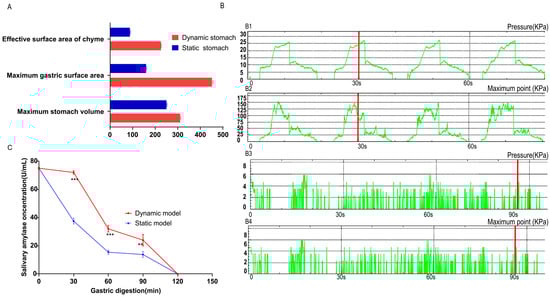 Volume, contact surface area, pressure, and salivary amylase activity in static and dynamic digestion models. (A) Maximum gastric volume and effective chyme–reactor contact surface area measured during the digestion of 20 g maize (solid food model). (B) Intragastric pressure profiles recorded in the two models. B1 denotes the mean pressure in the dynamic model, B2 the peak pressure in the dynamic model, B3 the mean pressure in the static model, and B4 the peak pressure in the static model. (C) Activity of salivary α-amylase in chyme at different time points during gastric digestion in the two models. ** p < 0.01. *** p < 0.001.